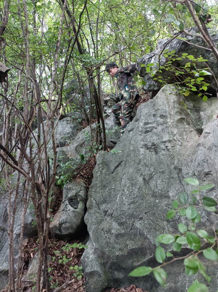 初到現(xiàn)場,沒有測繪人員引路,沒有地形地貌指示,沒有上山蹤跡可循,一切只得靠項目組成員自己去探索、去開拓,用腳步踏出一條條路,用身體力行去征服原始深山。由于缺乏上山經(jīng)驗,缺少開路工具,大家初始只能借助木棍在灌木叢生、荊棘遍布的深山中開墾出一條路。